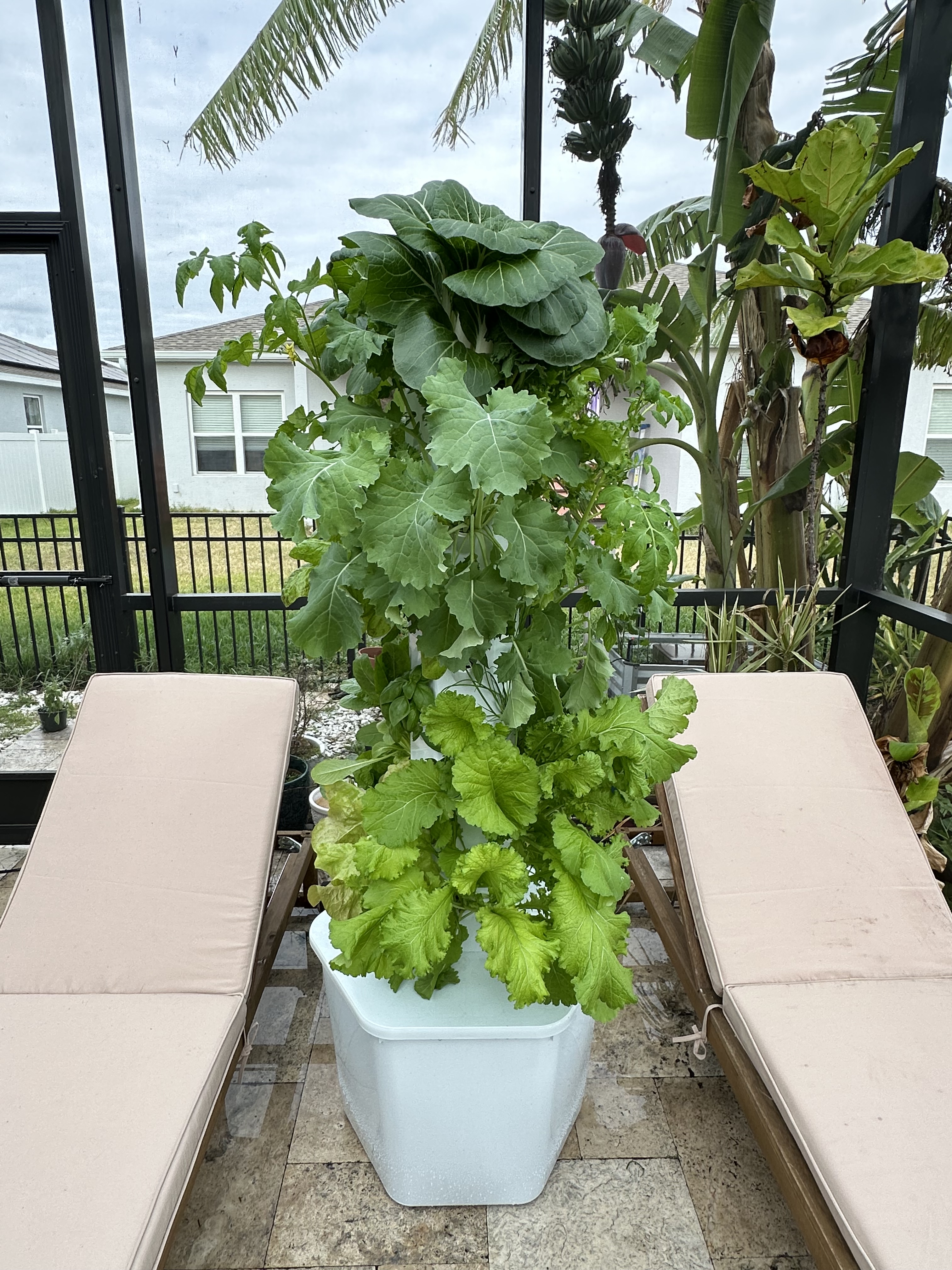 Inside our screened pool enclosure, we’ve set up a hydroponic tower system provided through the Step Up Scholarship Fund. This system has been a standout addition to our garden: